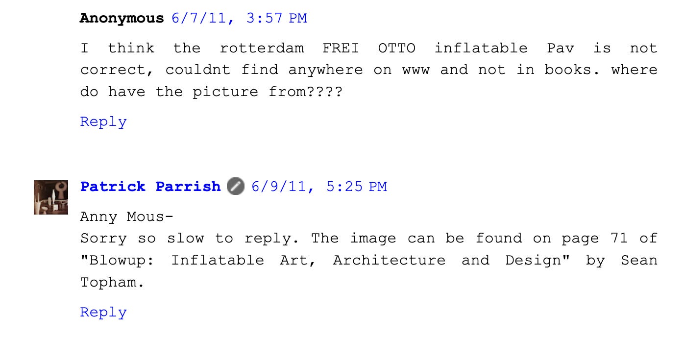 So that was the post from November 23rd, 2010. If you want to see the book this all was cobbled together from, try to find “blowup: inflatable art, architecture and design”, by Sean Topham for Prestle. Great book with a squishy cover!