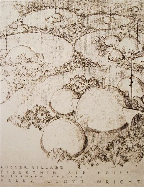 This was supposed to be a part of a “Rubber Village” at the 1957 New York Home Building Exhibition. I always assumed FLW was a little kinky, and now I have my proof!