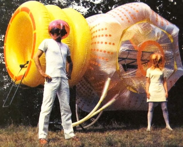 Michael Webb of Archigram Group with his full-size model of the “Cushicle”, 1967 (David Green inside). Looks comfy!