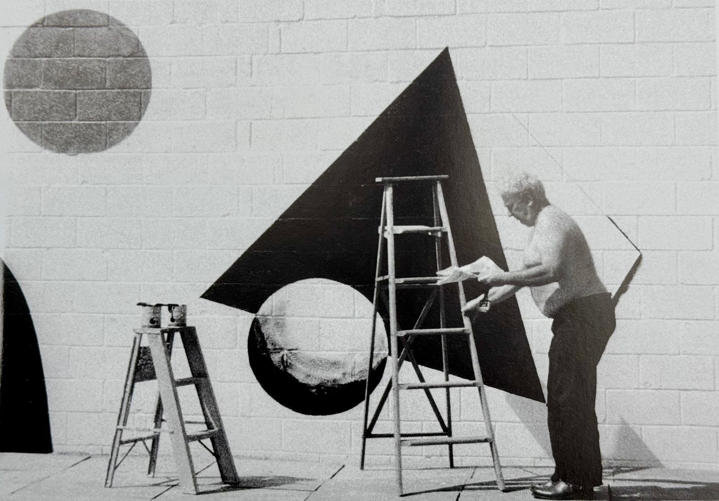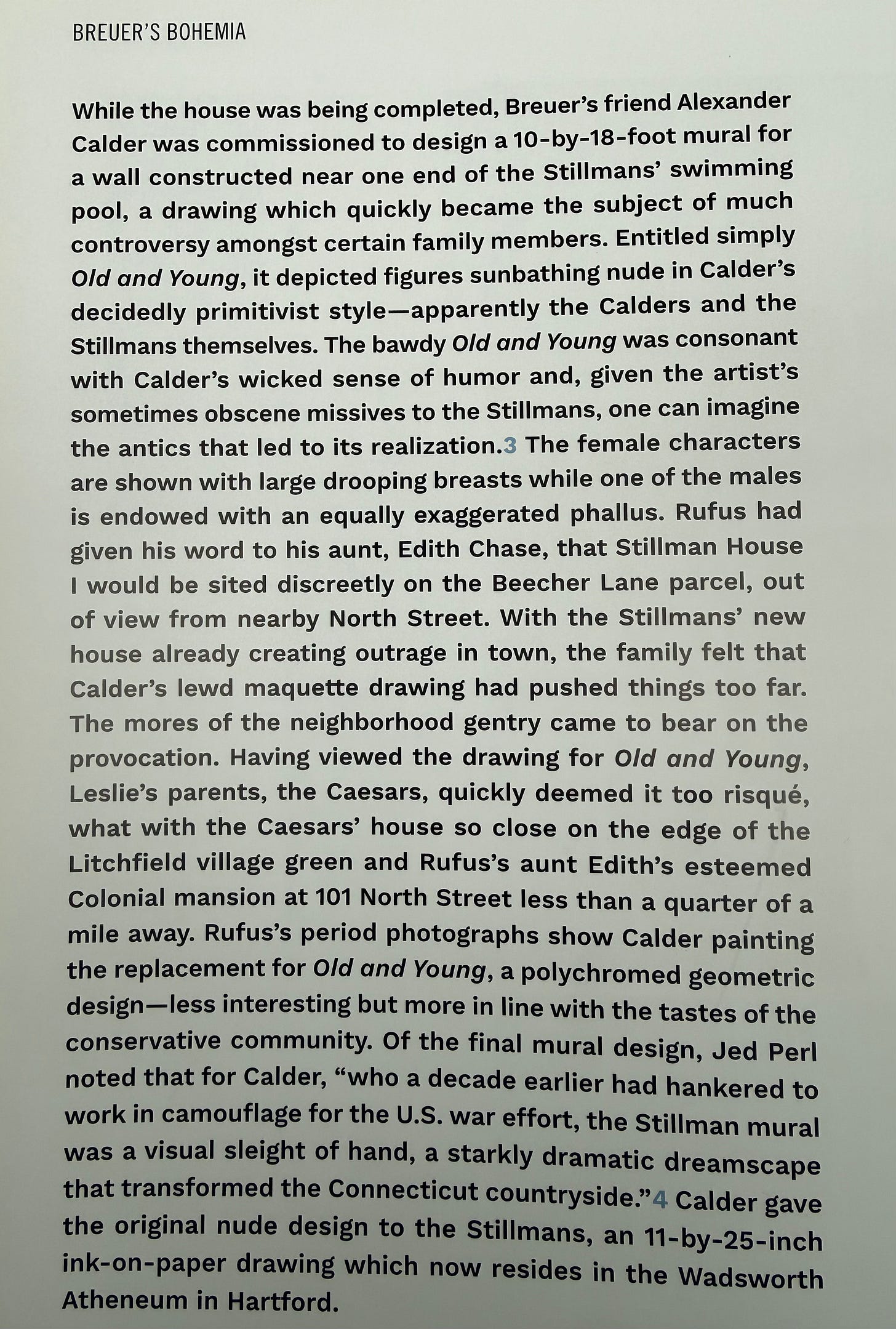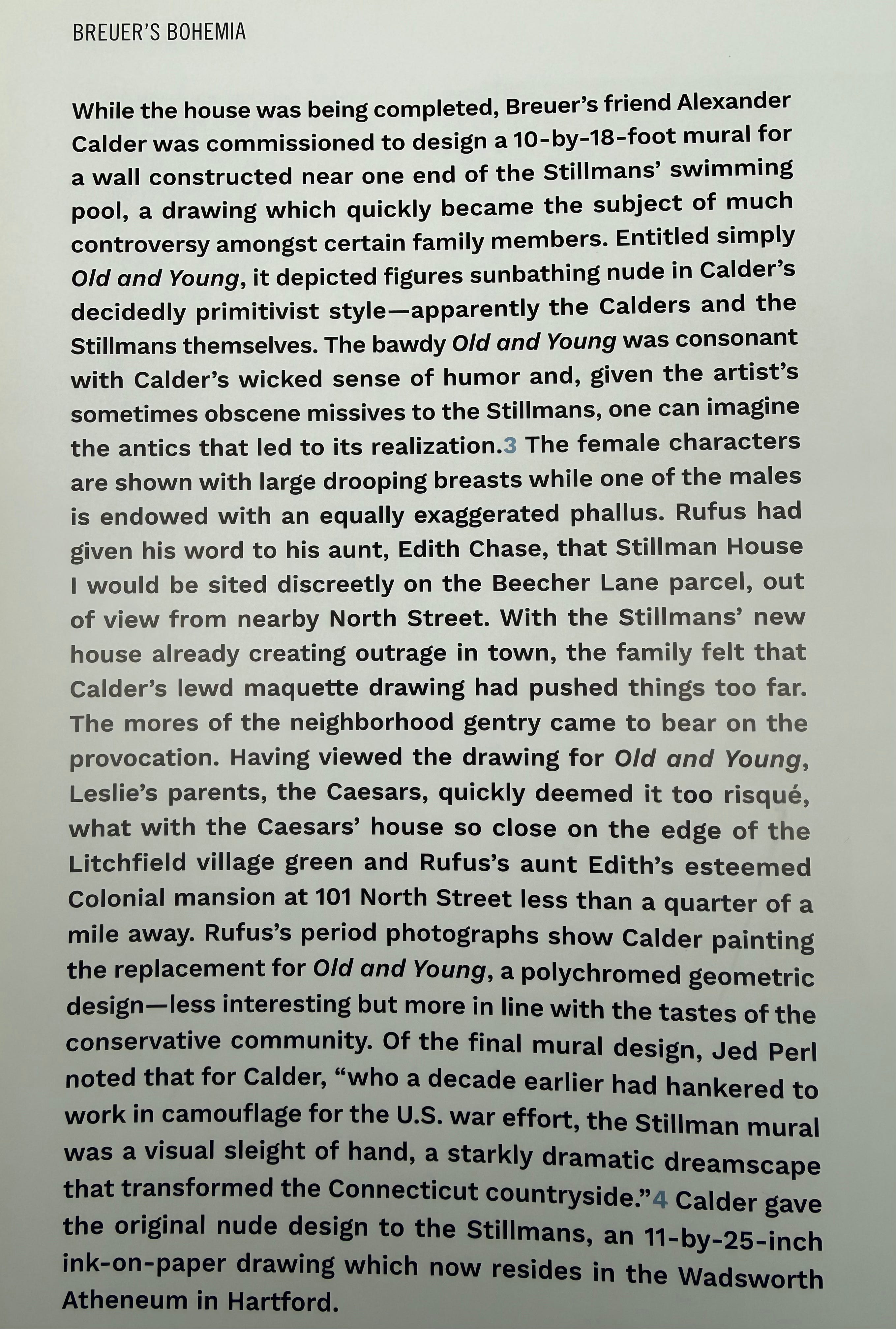 Here is Calder painting a mural at the Stillman House 1. His initial design was deemed to risqué for Litchfield. It was titled “Old and Young,” and the original 11” x 25” ink on paper is said to reside in the Wadsworth Atheneum in Hartford, but I can find no record of it, frustratingly. Here is James’s description of it, and please excuse the photo of the text as I can’t type!